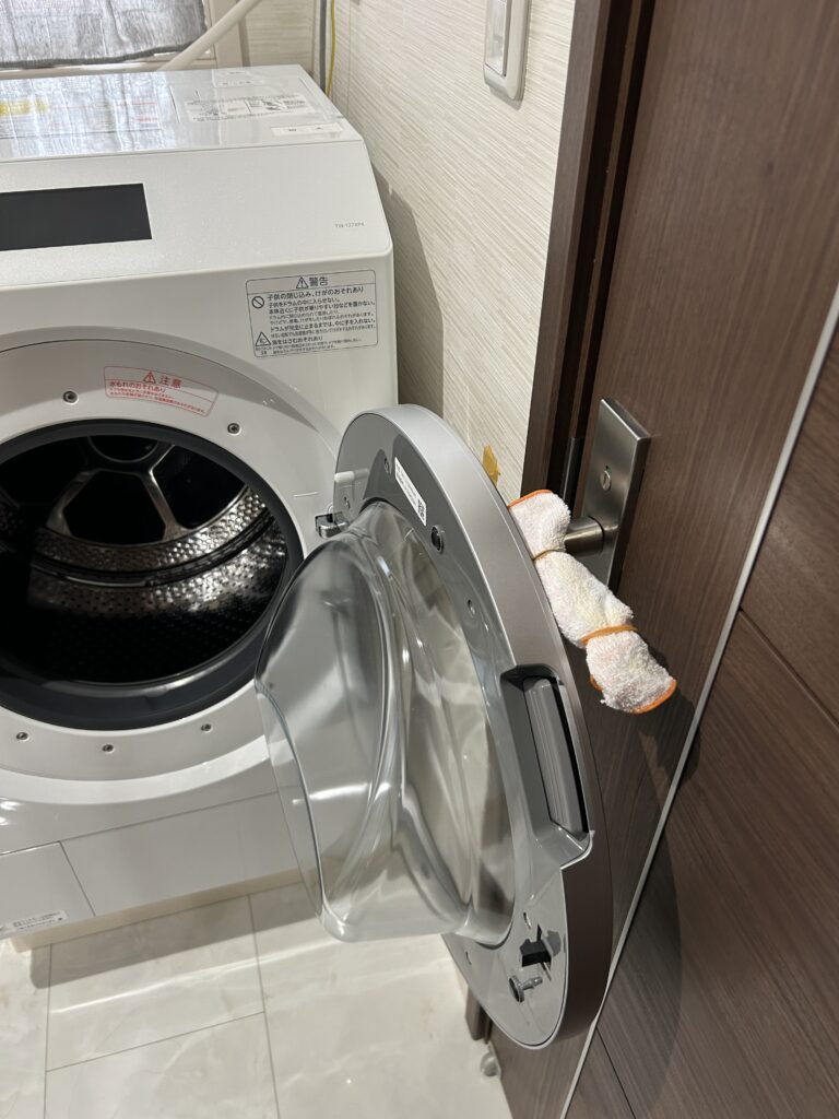 ちなみに我が家は洗濯機のドアを全開放するとこの様にトイレのドアと干渉してしまうので、