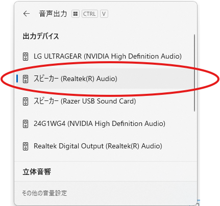 ちなみに元々モニターのスピーカーやUSB接続のヘッドフォン等を使用していた場合は、Windowsの音声出力を自分で切り替える必要があります。